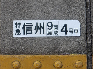 | 特急列車の乗車位置案内です。臨時と謳っていますが、毎平日に運転される通勤ライナーで、実質は定期列車です。 | 同じ列車の乗車位置案内です。通常E353系付属3両編成が稀に基本9両編成で代走する場合があり、後付けで設置されたようです。、 | |