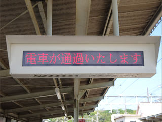 電車通過時の案内。厳重に注意を促すため、文言は赤色表示です。 | 電車到着時の案内。通過時に比べると危険度は低いというわけで、文言は橙色表示です。 | |