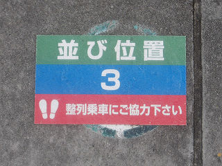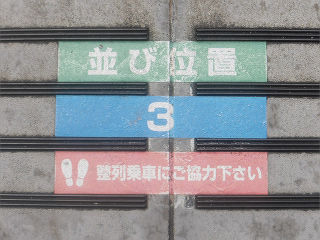 同じく、ホームにプリントされた乗車位置案内です。滑り止め付きのブロックへの貼付を想定し、3分割可能な構造となっています。 | 同じく、ホームにプリントされた乗車位置案内です。もはや何の案内か不明なほどに色褪せています。 | |