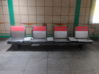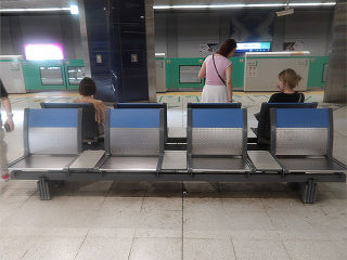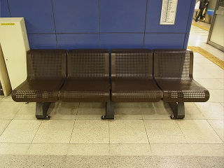 | 当駅の背もたれ上部は空色。未来都市に相応しいサイバーチックなデザインです。 | 非標準様式の金属製椅子です。2019年には現役でしたが、すでに過去帳入りしてしまったかもしれません。 | |