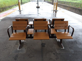 | ホームに設置されたFRP製の椅子です。開業時に設置されたようで、大町以西の駅では標準様式です。 | ホームに設置された金属製の椅子です。駅内の椅子は、ホーム待合室、改札内待合所も含めてこれに統一されているようです。 | |