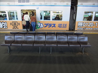 | FRP製の椅子です。隣席と隙間のない配置はいかにも都会の駅といった風情です。 | 同じくFRP製の椅子ですが、背もたれと座面の形状が若干異なっています。 | |