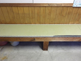 | ホームに設置されたFRP製椅子です。背もたれ部分には車両側面と同じ装飾が施されています。 | 待合室に設置された木製長椅子です。特に産地と言うわけではなさそうですが、座面には畳表が貼られています。 | |