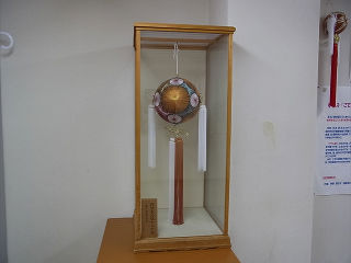 | 旧駅舎改札前に設置された「ごてんまり」です。新駅舎は天井が低く、一回り小さなサイズが設置されています。 | 旧駅舎待合室に設置されたごてんまりです。サイズは小さいですが、金糸を多用して豪華な見た目です。 | |