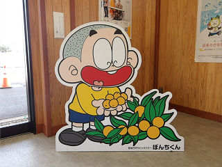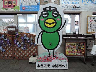 | 都城市のキャラクター「ぼんちくん」の看板です。本名「諸方 ぼんち」。いがぐり頭のかわいい少額2年生です。 | 中間市のキャラクター「なかっぱ」の看板です。身長、体重ともきゅうり3本分。好きな食べ物も当然きゅうりです。 | |