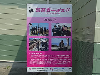 | 駅前のタブノキを紹介する看板です。樹齢700年とも言われ、観光列車「四国まんなか千年ものがたり」のデザインにも採用されています。、 | 映画「書道ガールズ」のロケ地を記念して設置された看板です。2010年の公開当時若手だった出演者も、すっかり中堅どころとなりました。 | |