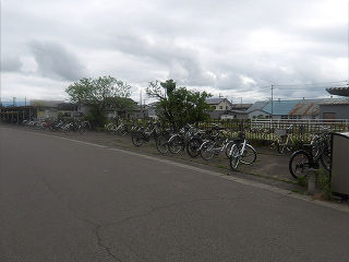| 駅前の駐輪場。上屋や側壁はなく、思い思いに自転車が置かれています。 | 切符売場と改札口。2020年に無人化され、窓口にはシャッターが下ろされています。 | |