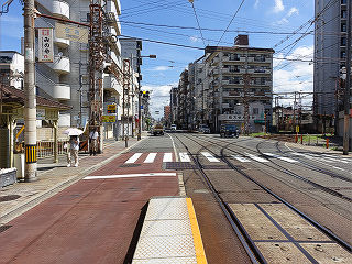 | 上町線浜寺駅前方面乗場。緑のテント式上屋は、一時期近鉄だった名残...なのでしょうか? | 浜寺駅前方面。すぐ先で上町線と平面交差していますが、道路の交通量は少なく。ほぼ渋滞はありません。 | |