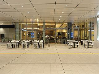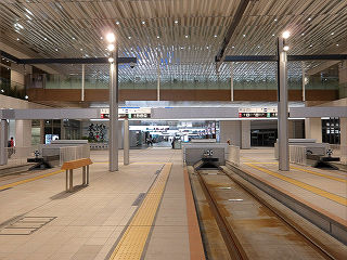 | 停留所正面より全景。大きな吹き抜けが開放感を演出しています。JR在来線改札口からは平面移動で1〜2分。大きな荷物を持った旅行者にも優しい構造です。 |