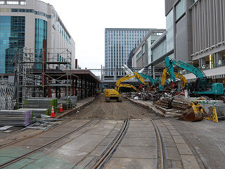 | ホーム西側のカフェにはテラス席が。電車の発着を見ながら優雅にコーヒーでもいかがでしょうか。 | 8月下旬の旧停留所状況。ホームの撤去が進んでおり、ほどなく跡形もなくなりそうです。 | |