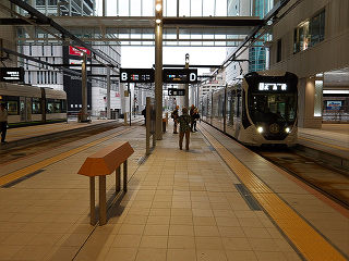 | 広電西広島方面。ホームは4面4線。系統毎に乗場が分かれてわかりやすくなりました。 | 路線始端方面。駅ビル3階の通路からは停留所のを一望することが可能です。 | |