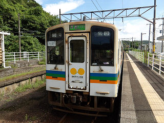 | 八代方面。下りホームには簡素な待合所が設置されています。 | 発車待ちの上り列車。取材日は台風による被災のため、当駅以南が運休中でした。 | |