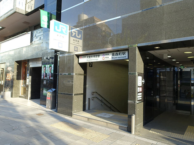 | 駅西の7号出入口。オフィスビルの1階に位置し、エレベータが併設されています。 |