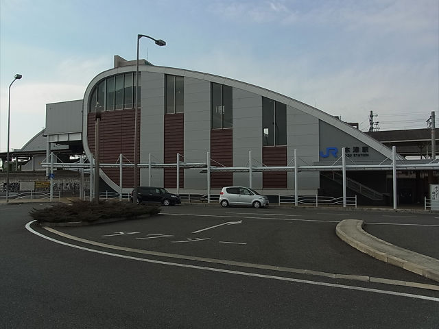 | 橋上駅舎の東口。鯨が水面に頭を出したような奇抜な形状の橋上駅舎です。木津川の流れをイメージしたとのことです。木津川市の代表駅らしく駅前広場も整備されています。 |