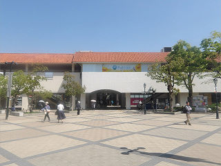 | 駅西より全景。2階建ての大きなコンクリート造駅舎です。駅舎のリニューアルに伴い、正面の巨大な壁画は撤去されてしまいました。 |