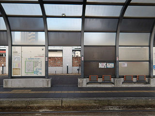| 路線終端方面。車止めが設置され、終着駅らしい雰囲気に生まれ変わりました。 | 乗車ホーム。折り返しの電車が在線していることが多いですが、折り畳み式の椅子も設置されています。 | |