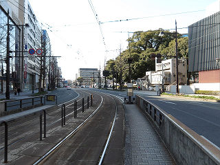 | 電車は北に進み、花畑町に到着します。九州新幹線開業に先立って、余所者泣かせの旧名熊本城前から改称され、なんとはなしに晴れ晴れとした雰囲気が感じられるのは気のせいでしょうか。 |
