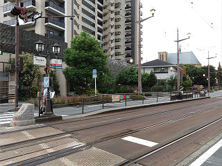 | 電車は東に進み、神水交差点に到着します。熊本市民病院の最寄に位置するため、2011年に改称された当停留所ですが、肝心の市民病院が移転したためわずか8年で再改称されることとなりました。 |
