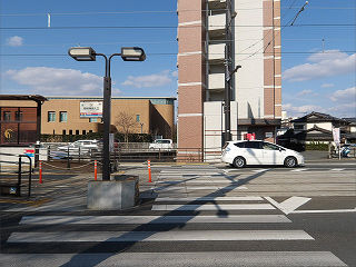 | 停留所入口。ホームには横断歩道からスロープで連絡します。 | 健軍町方面。ホームは相対式2面2線。以前に比べて幅はほぼ倍になりました。 | |
