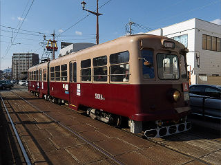 | 田崎橋・上熊本方面。ホーム面には周辺ではおなじみのタイルが敷き詰められています。 | この日引退となる元西鉄の5000系電車が、健軍町に向けて発車して行きました。 | |