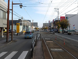 | 上熊本方面乗場。ホーム柵は簡素なパイプです。ないよりはマシですが。 | 辛島町方面。両方面のホームは、交差点を挟んでの千鳥配置です。 | |