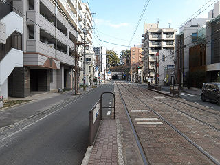 | 電車は熊本城公園の南西に沿って進み、蔚山町に到着します。地名の由来は文禄・慶長の役で加藤清正が居城し、その後来日した渡来人の出身地である蔚山に因むと伝えられていますが、昭和30年代の町名変更により新町と改称され、停留所名にのみ半島文化の面影を残しています。 |