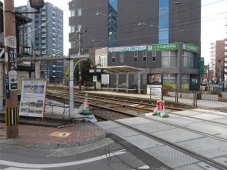| 健軍町方面電車が停車中。併用軌道と専用軌道の境界にいちするため、ホームの形状は非常に変則的です。 |