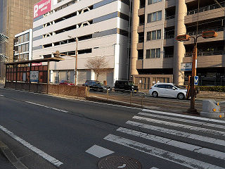 | 電車は併用軌道上を東に進み、西辛島町に到着します。日本有数のバスターミナル、桜町バスターミナルの南に位置し、周囲はビジネスホテルが多数立地しています。 |