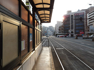| 辛島町方面乗場全景。市街地中心部の停留所らしく、バリアフリー対応で上屋も整備されています。 |