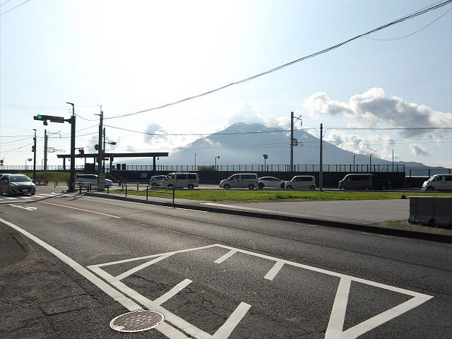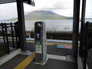| 駅舎のない無人駅です。正面には桜島が聳え立ち、風光明媚なロケーションですが、しばしば起こる桜島の噴火時には灰だけではなく石も飛んでこないか少々不安です。 |