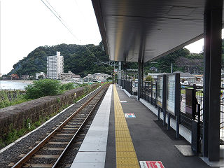 | ホーム入口。前述の通り無人駅でICカード専用改札機が設置されています。 | 鹿児島方面。ホームは1面1線。国道10号線と海に挟まれた狭隘な立地で、幅は広くありません。 | |