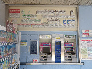 | 駅南より高架ホームを。壁面には駅名のほかにキャッチフレーズが掲げられています。 | 切符売場。券売機は2台。利用状況からすると1台で十分に思われます。 | |