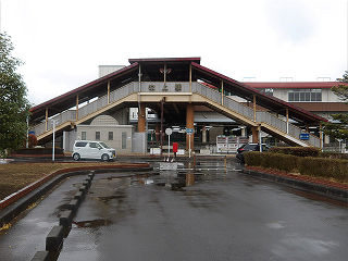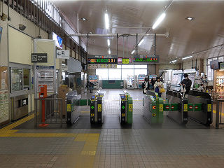 | 裏口めいた佇まいの南口。北口との賑わいの差は歴然としています。 | 切符売場。券売機が2台と指定席券売機が1台設置されています。 | |