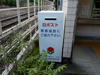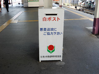 | 待合室に設置された白ポストです。設置主体は青少年育成山梨県民会議ということで、県内全域で白ポストを設置しているようです。 | 駅前に設置された白ポストです。乗降客も少ない無人駅ですが、盗難の心配はないのでしょうか。 | |