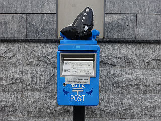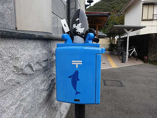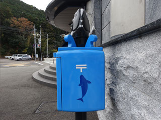 | 捕鯨の町として知られる太地町。ポスト上にはセミクジラが顔を覗かせています。 | 正面左から。セミクジラは郵便配達員なのでしょう。郵便カバンを抱え、手紙を差し出しています。 | |