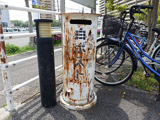 | 駅前に設置された白ポスト。でかでかと「白ポスト」と主張していますが、錆ひるに任せた現状は「茶ポスト」と呼ぶのがふさわしいかと。 | 同じく、駅前に設置された白ポスト。五・七・五の名調子は悪書回収ポストと言うより、川柳投稿ポストのようです。 | |