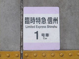 | 特急列車の乗車位置案内です。臨時と謳っていますが、毎平日に運転される通勤ライナーで、実質は定期列車です。 | 同じ列車の乗車位置案内です。通常E353系付属3両編成が稀に基本9両編成で代走する場合があり、後付けで設置されたようです。、 | |