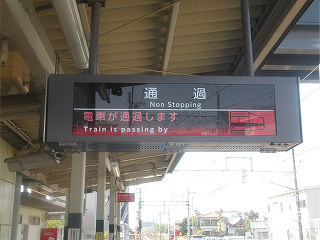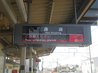 | ホームに設置された液晶式発車案内です。上部は列車時刻、下部は旅客への案内事項が表示と役割が分担されています。 | この種の機器は多言語対応が主流ですが、英語対応のみかつ、列車時刻表示の切り替わりもない潔さは個人的に好感度大です。 | |