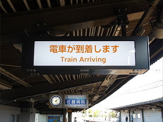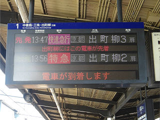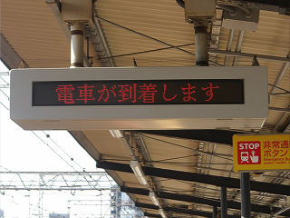 | LED式の列車到着案内です。表示は1行のみで、日本語と英語表記が切り替わります。 | 新型の液晶式列車到着案内です。画面が広く、日本語、英語表記が同時に表示されます。 | |