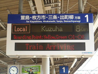 | 近畿地方の列車案内。続いては、京阪電気鉄道のホームに設置された、列車近接案内をご紹介します。 | ||