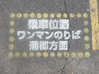 | 数字のみの乗車位置案内です。編成中の何両目を示すものか、ドア位置を示すものか...おそらく前者なのでしょうが...。 | ワンマン列車の乗車位置案内です。ワンマン、ワンマン、大事なことなので2回書きました。 | |