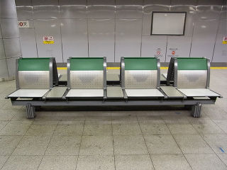 | ホームに設置された標準仕様のベンチです。ステーションカラーではありませんが、背もたれ上部は着色されています。 | 同じく、ホームに設置された標準仕様のベンチです。当駅および新木場駅の背もたれは、緑色に着色されています。 | |