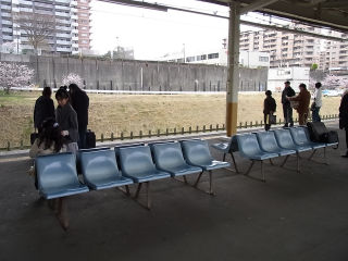 | ホームに設置されたFRP製椅子です。前述のものとは若干様式が異なり、設置が古かったのか2025年時点で現存していません。 | 前述に代わって設置された椅子です。転落事故防止の配置は、関東にもじわじわと浸透しています。 | |