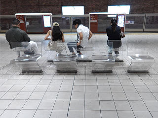 | アクリル製の椅子です。東京メトロの副都心線とは異なり、イラストはなく透明です。、 | 芸術作品テイストに溢れる椅子です。見た目に座り心地が良さそうにありませんが、はたしてその実は? | |