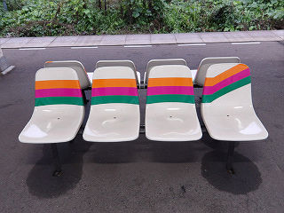 | ホームに設置されたFRP製椅子です。背もたれ部分には車両側面と同じ装飾が施されています。 | 待合室に設置された木製長椅子です。特に産地と言うわけではなさそうですが、座面には畳表が貼られています。 | |