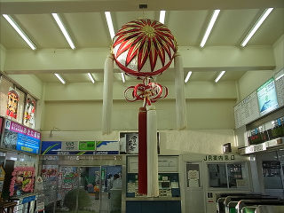 | 旧駅舎改札前に設置された「ごてんまり」です。新駅舎は天井が低く、一回り小さなサイズが設置されています。 | 旧駅舎待合室に設置されたごてんまりです。サイズは小さいですが、金糸を多用して豪華な見た目です。 | |
