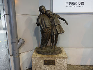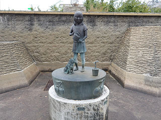 | 東口駅前に設置された姉弟像です。昭和26年の東口開設記念ということであれば、75年ほど経過していることになりますが、果たして? | 駅前に設置された、犬と戯れる少女像です。タイトルは「なかよし」。芸術に疎い私にも納得です。 | |