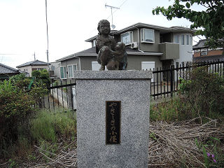 | 東口に設置された兄妹像です。タイトルは「健やかに」ですが、私には酔った女性を引きずって歩いているようにしか見えません。 | 駅前広場外れに設置された、犬を連れた少女像です。タイトルは「薫風」。初夏の爽やかな風景をイメージしたのでしょう。 | |