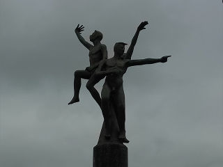 | 3人の男性が背中合わせに密接する像です。何か叫んでいるように見えますが、詳細は不明です。 | タイトルは「ずっと青空」。男性2人の像です。港町の情景を表しているのでしょうか。魚を抱えているように見えます。 | |