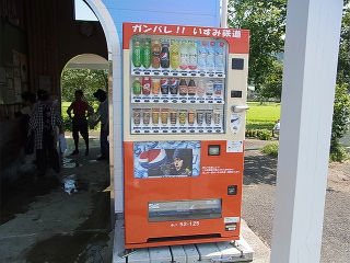 | 駅前に設置された、キハ28&52装飾のいすみ鉄道応援自動販売機です。他にいすみ鉄道オリジナルカラーバージョンも存在します。 | 側面の図。車両前面をイメージしているようですが、いかんせん幅が狭すぎるかと...。 | |